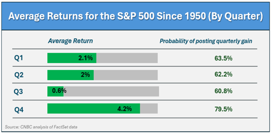 While no one has a crystal ball, and past results do not reflect future ones, it’s interesting to note that based on historical data for the S&P 500 index, the fourth quarter is the strongest-performing quarter for equities. Since 1950, it has delivered the highest average return and the highest probability of posting a gain. (Source: finance.yahoo.com; 9/25/25)