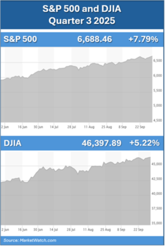 The S&P 500 gained 7.79% in the third quarter, closing at 6,688.46. Year-to-date, as of September 30, the S&P 500 is up almost 14%. The Dow Jones Industrial Average (DJIA) closed at a record high, gained 5.22% and ended the quarter at 46,397.89. Year-to-date, as of September 30, the DJIA is up over 9%.
