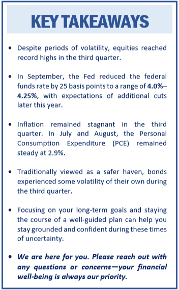 Since the recovery from the quick correction we saw in April, the market has rallied. While investors have a bullish outlook, a backdrop of caution and uncertainty remains. During the third quarter, the U.S. job market showed signs of cooling but remained strong. While a prolonged government shutdown could increase the unemployment rate in the near future, as of August, the unemployment rate was slightly elevated to 4.3%, the highest in nearly four years. (Source: Bureau of Labor Statistics; 9/5/25)